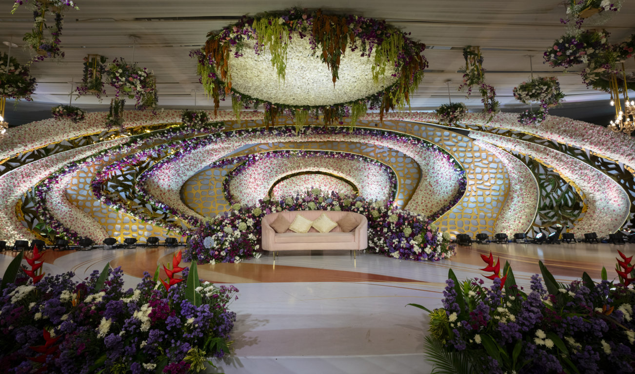 Bespoke reception décor featuring premium styling, floral concepts, lighting, and personalized details for a grand celebration.